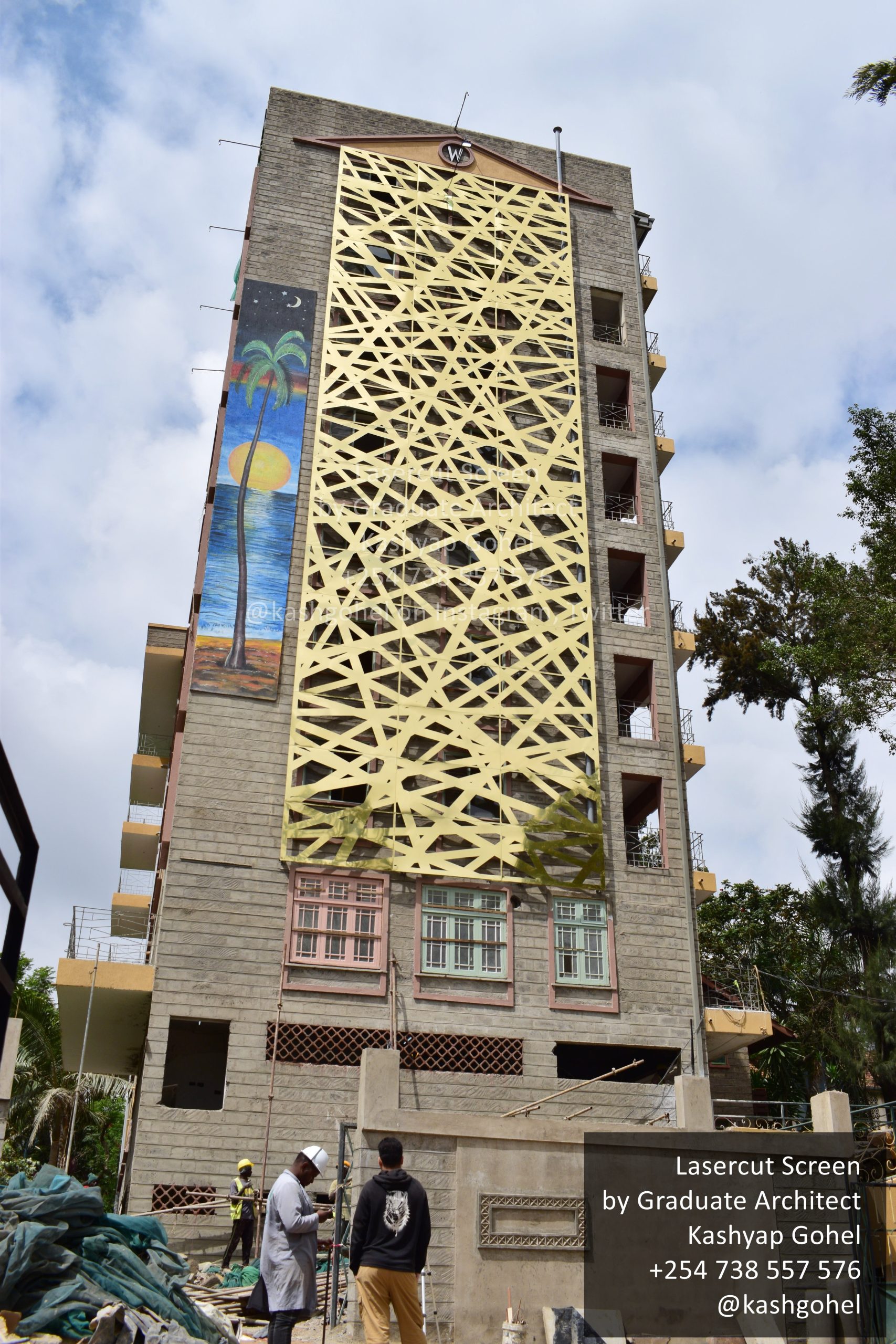 I contributed to the design of the golden lasercut facade screen for Woodmere Grand Hotel & Serviced Apartments in Kilimani, Nairobi, as well as painting the concept artwork for the mural on the left of the facade screen.